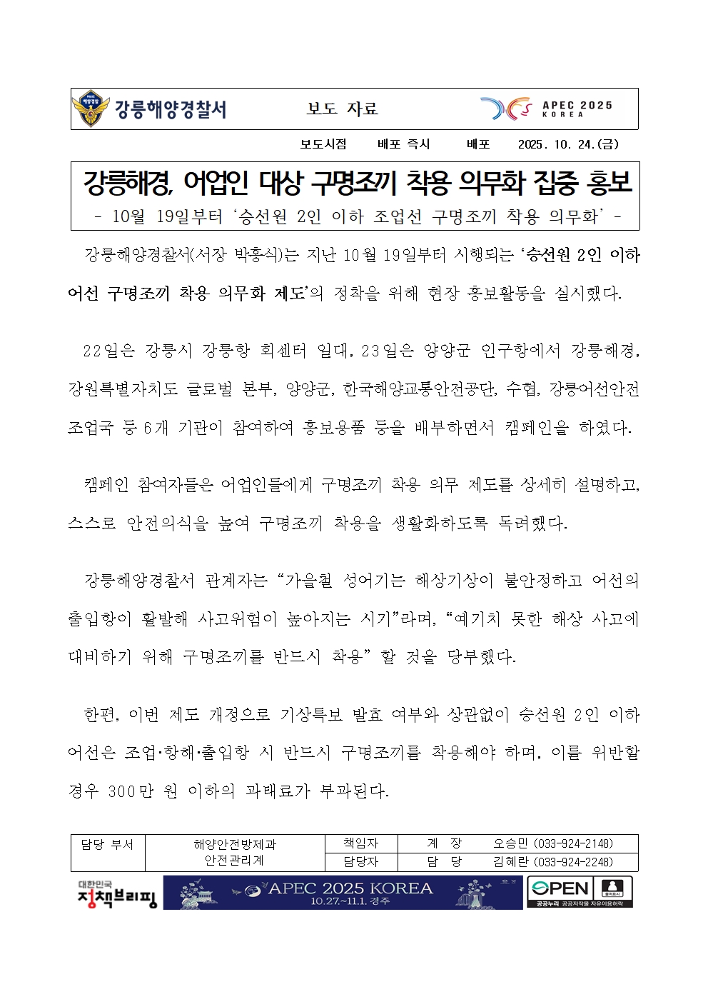 해양경찰청이(가) 창작한 (25.10.24.) 강릉해경, 어업인 대상 구명조끼 착용 의무화 집중 홍보 저작물은 공공누리 "OPEN공공누리 : 공공저작물 자유이용허락 마크(출처표시+상업적 이용금지+변경금지)" 조건에 따라 이용할 수 있습니다.