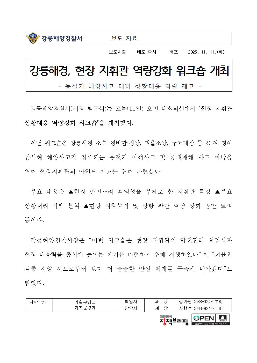해양경찰청이(가) 창작한 (25.11.11.) 강릉해경, 현장 지휘관 역량강화 워크숍 개최 저작물은 공공누리 "OPEN공공누리 : 공공저작물 자유이용허락 마크(출처표시+상업적 이용금지+변경금지)" 조건에 따라 이용할 수 있습니다.